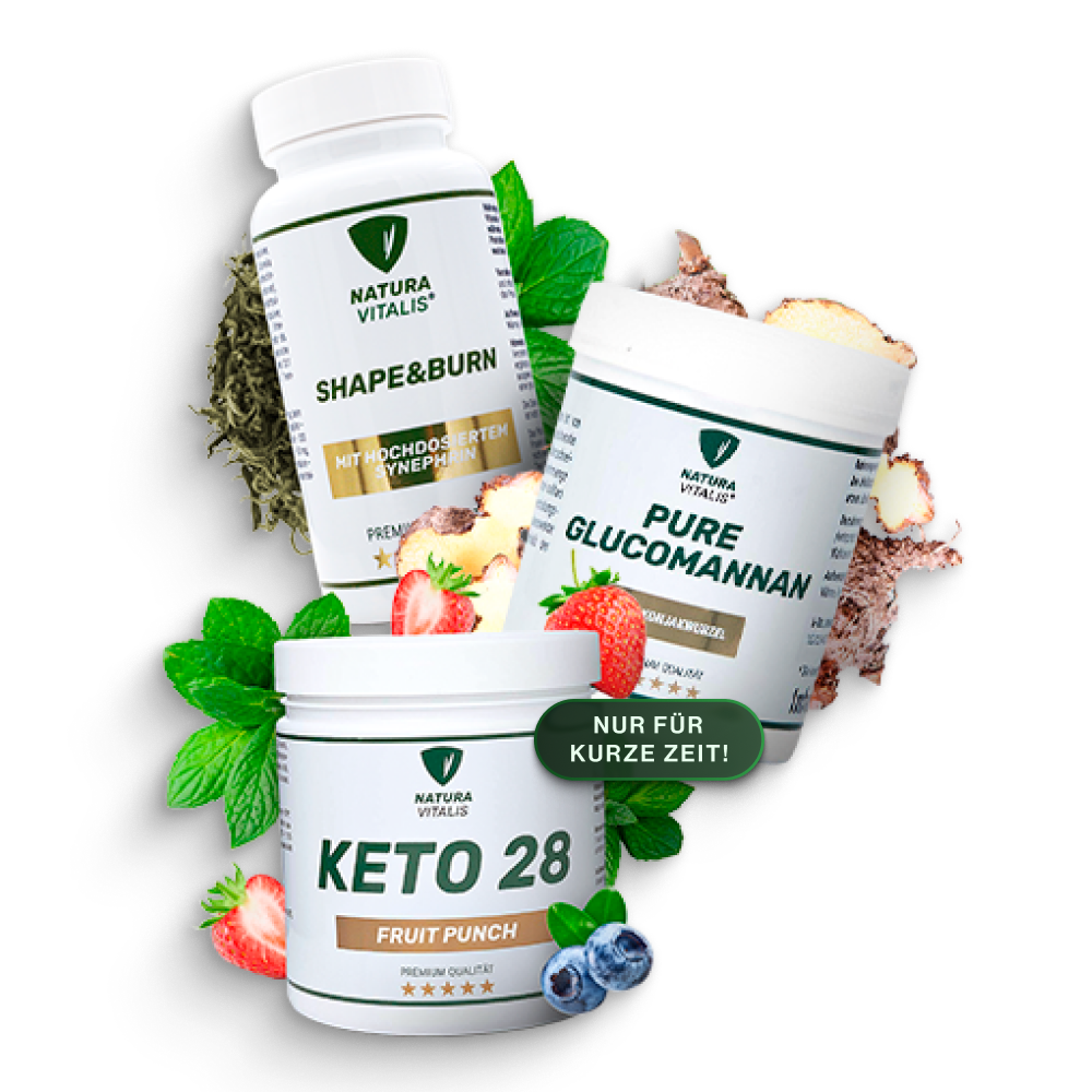 Eine erfolgreiche Gewichtsreduktionsmaßnahme besteht aus mehreren Bausteinen: bewusster Ernährung, Bewegung, ausreichender Flüssigkeitszufuhr – und einem gut funktionierenden Stoffwechsel. Genau hier setzt das Diät-Bundle von Natura Vitalis an. Die Kombination aus KETO 28, Pure Glucomannan und Shape & Burn wurde entwickelt, um den Körper während einer kalorienbewussten Ernährungsphase gezielt zu begleiten und zu unterstützen.